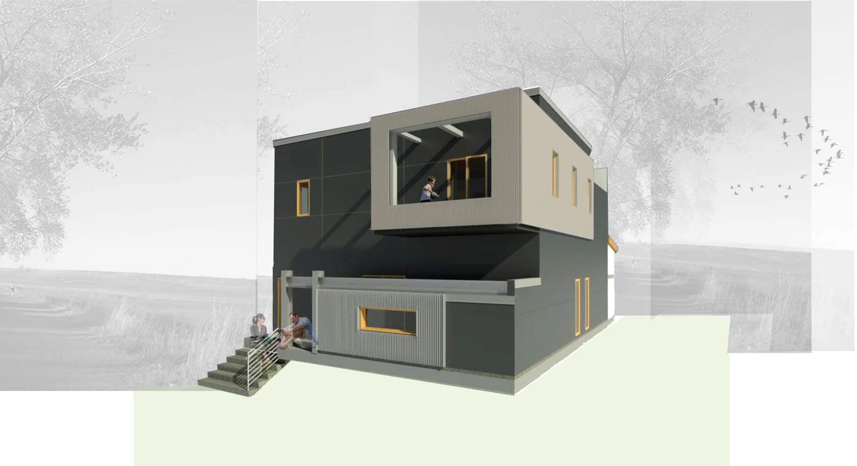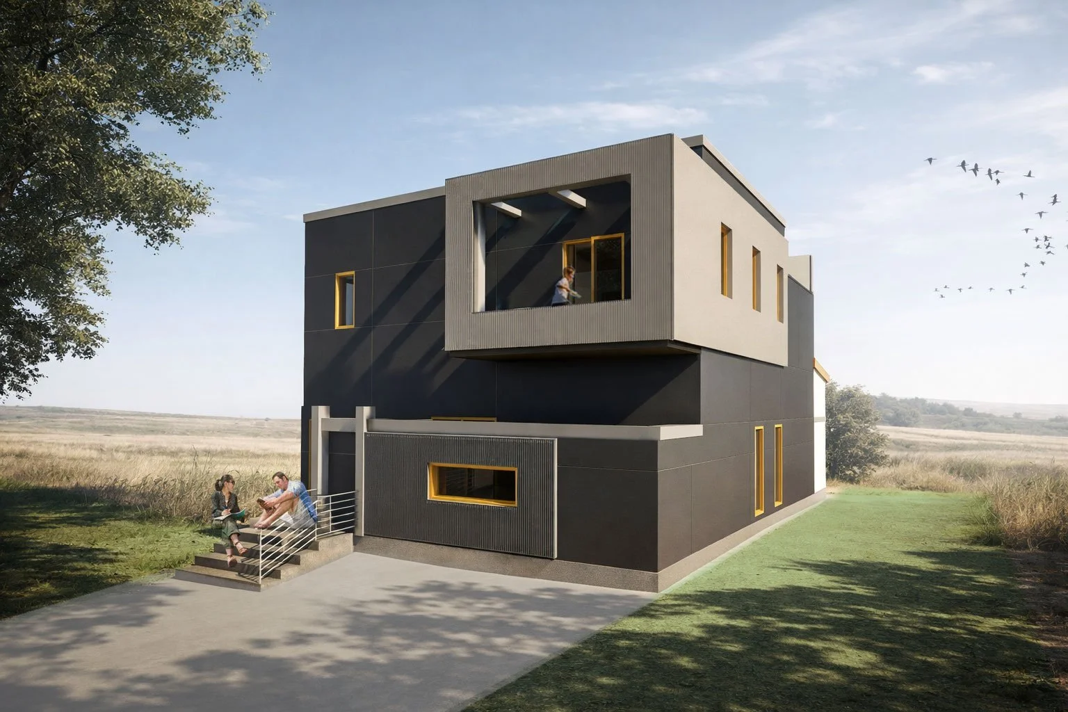 This two-story contemporary residence explores minimalism through clarity of form and spatial discipline. Clean geometries and deliberate proportions define the architecture, while layered volumes create moments of tension and balance between solid and void. The home accommodates three bedrooms, an open kitchen, and elevated living spaces that extend onto a balcony, reinforcing a dialogue between interior and exterior. Light, structure, and movement shape the experience of the house, resulting in a composed yet dynamic domestic environment.
